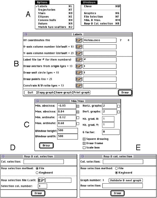 Fig. 2. Elements of the user interface of graphical modules. A: the Options menu serves to choose the type graphic, and the Windows menu can be used to choose one of the three parameter windows (B, C, D and E). The main dialog window (B) works in the same way as in computation modules. The "Min/Max" window (C) allows to set the value of numerous graphic parameters, particularly the minimum and maximum of abscissas and ordinates, the number of horizontal and vertical graphics (for graphic collections), the graphical window width and height, legend scale options, etc. The "Row & Col. selection" window (D and E) has two states (File and Keyboard), corresponding to the way of entering the selection of rows making a collection of graphics. In the File state (D), the user can choose a file containing the qualitative variable which categories define the groups of rows, and in the Keyboard (D) state, he must type in the numbers of the rows belonging to each elementary graphic.
