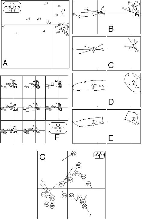Fig. 4. Example of graphics drawn with the Scatters module: labels (A), trajectories (B), stars (C), ellipses (D), convex hulls (E), circles and squares (F: circles are for positive values, squares for negative ones), and two scatters matching (G). The coordinates of points are given by two columns chosen in a table. In this module, elementary graphics of a collection correspond to groups of rows, except for the circles and squares option, in which they can correspond to groups of rows and also to the columns of the file containing the values to which circle and square sizes are proportional (in this case, if there are k groups and p columns, the number of elementary graphics will be equal to k.p).