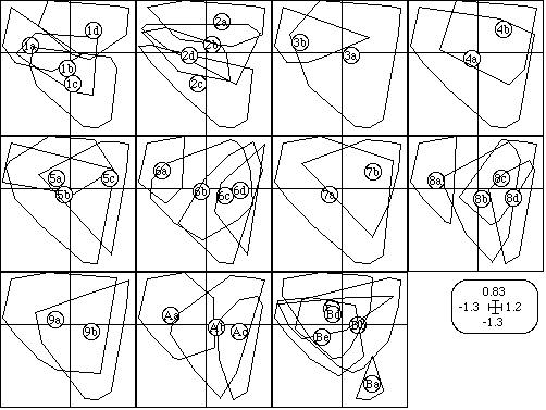 The ScatterClass module incorporates the Labels, Trajectories, Stars, Ellipses and Convex hulls options. It superimposes the elementary graphics corresponding to a collection. Figure 5 shows an example where eleven elementary graphics (corresponding to eleven qualitative variables) are represented. In each graphic, several convex hulls (corresponding to groups of points) are superimposed. The points themselves are not drawn.